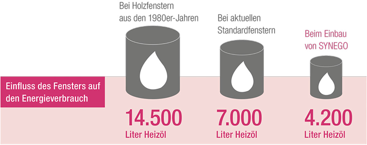 Neue SYNEGO Fenster sind das ideale Sparprogramm. Im Vergleich zu aktuellen Standardfenstern bietet Ihnen SYNEGO bis zu 50 % mehr Wärmedämmung. Sie senken spürbar Ihre Heizkosten und steigern den Wert Ihrer Immobilie – heute, morgen und übermorgen.